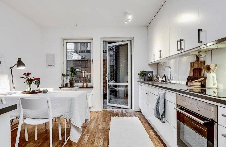 Грамотно распорядиться квадратными метрами можно, установив гарнитур вдоль одной из стен. Пространство у окна идеально для размещения обеденного стола. Посередине помещения прекрасно впишется небольшая барная стойка. А территорию балкона можно использовать как место для приготовления пищи и хранения продуктов.