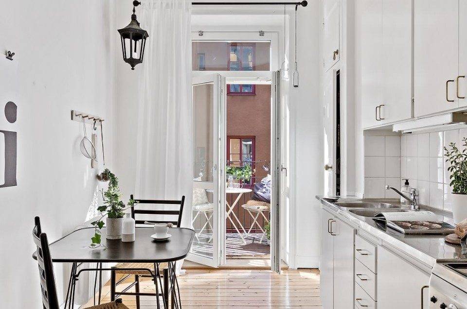 Если кухня очень узкая, лучше разместить там Г-образный гарнитур, а обеденную зону вынести на балкон.