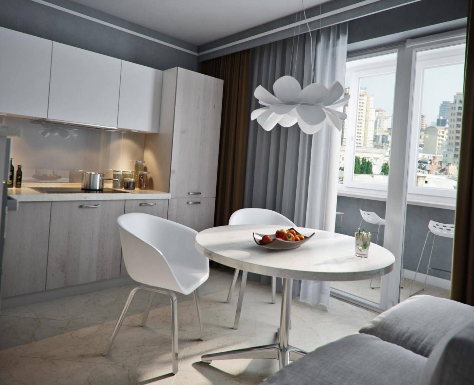 Небольшая кухня тоже может быть стильной. Если вы объединяете ее с балконом, лучше сделать рабочее пространство в основном помещении. На балконе целесообразно установить компактный диван, стол и стулья, либо барную стойку.