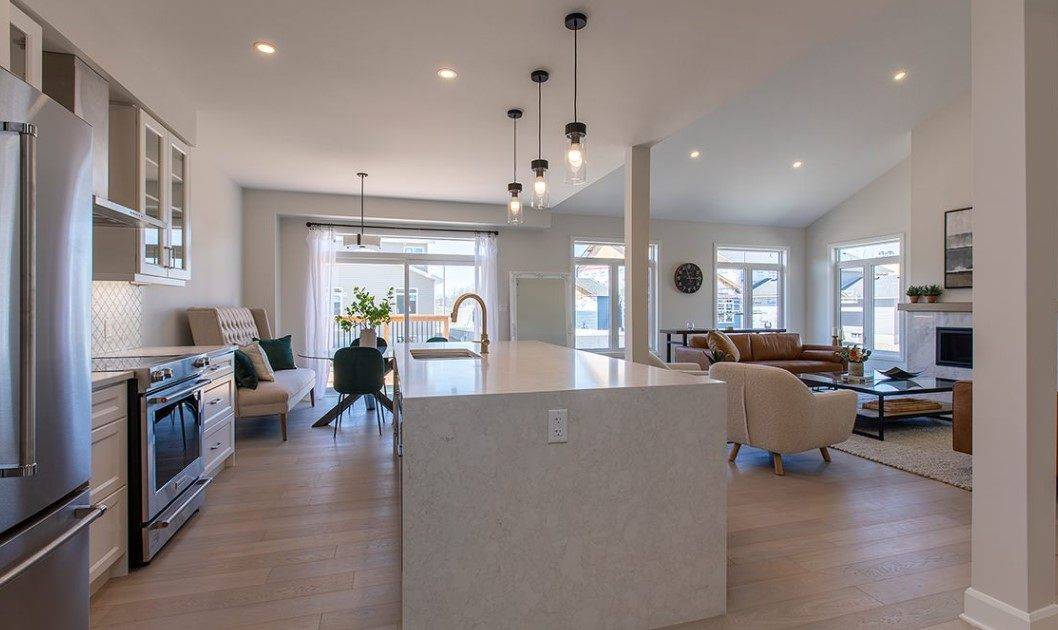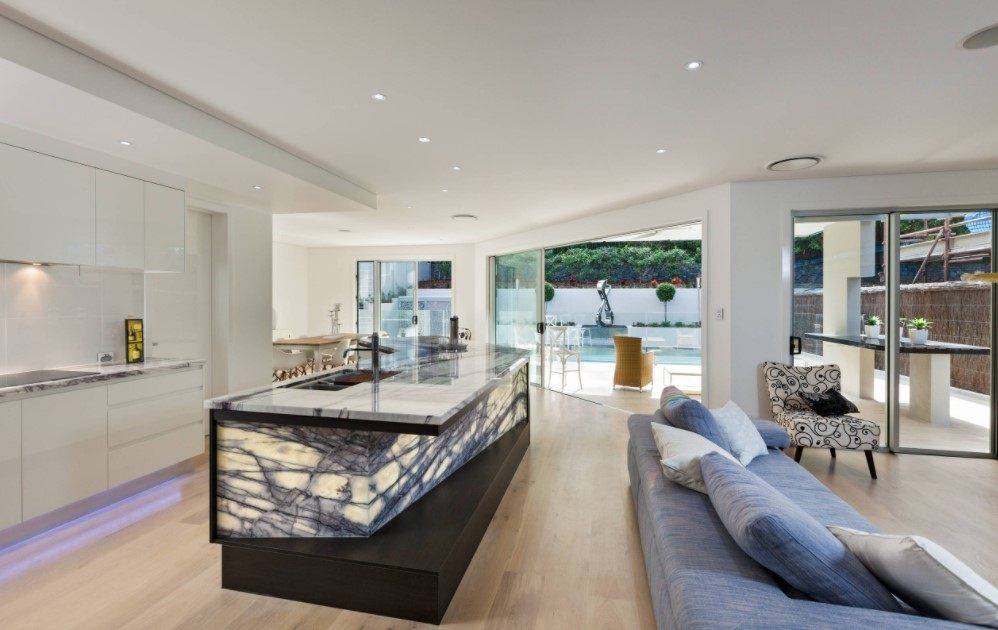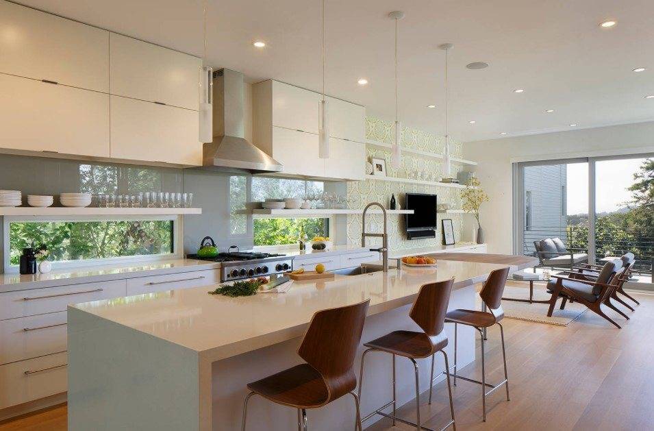 Важно выбрать грамотный вариант зонирования. Можно установить остров или барную стойку, отделив рабочее пространство