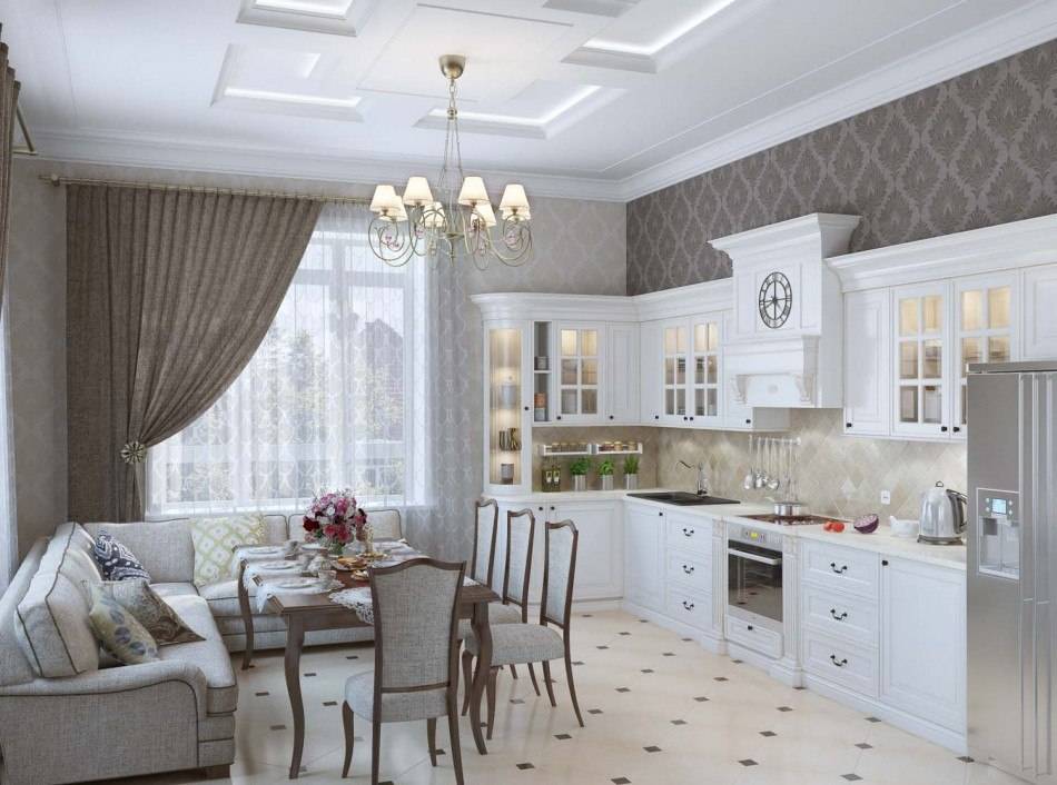 Потолок классический в белом цвете, сочетается с паркетом пола. Часть кухонной территории застилают керамогранитом с фактурой состаренной доски или с ковровым рисунком. Допускаются украшения потолка лепниной или многоступенчатой конструкцией, для определения каждой отдельной зоны.