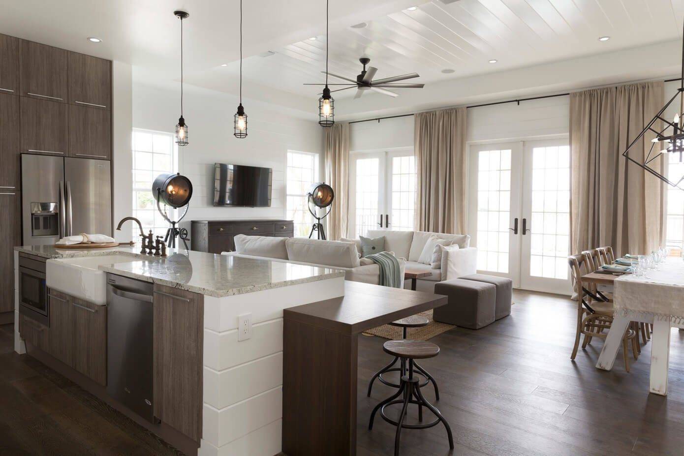 Чтобы помещение было не только стильным, но и функциональным, необходимо выполнить зонирование общего пространства. Существует множество дизайнерских приемов, когда кухня-гостиная становится максимально комфортной и удобной.