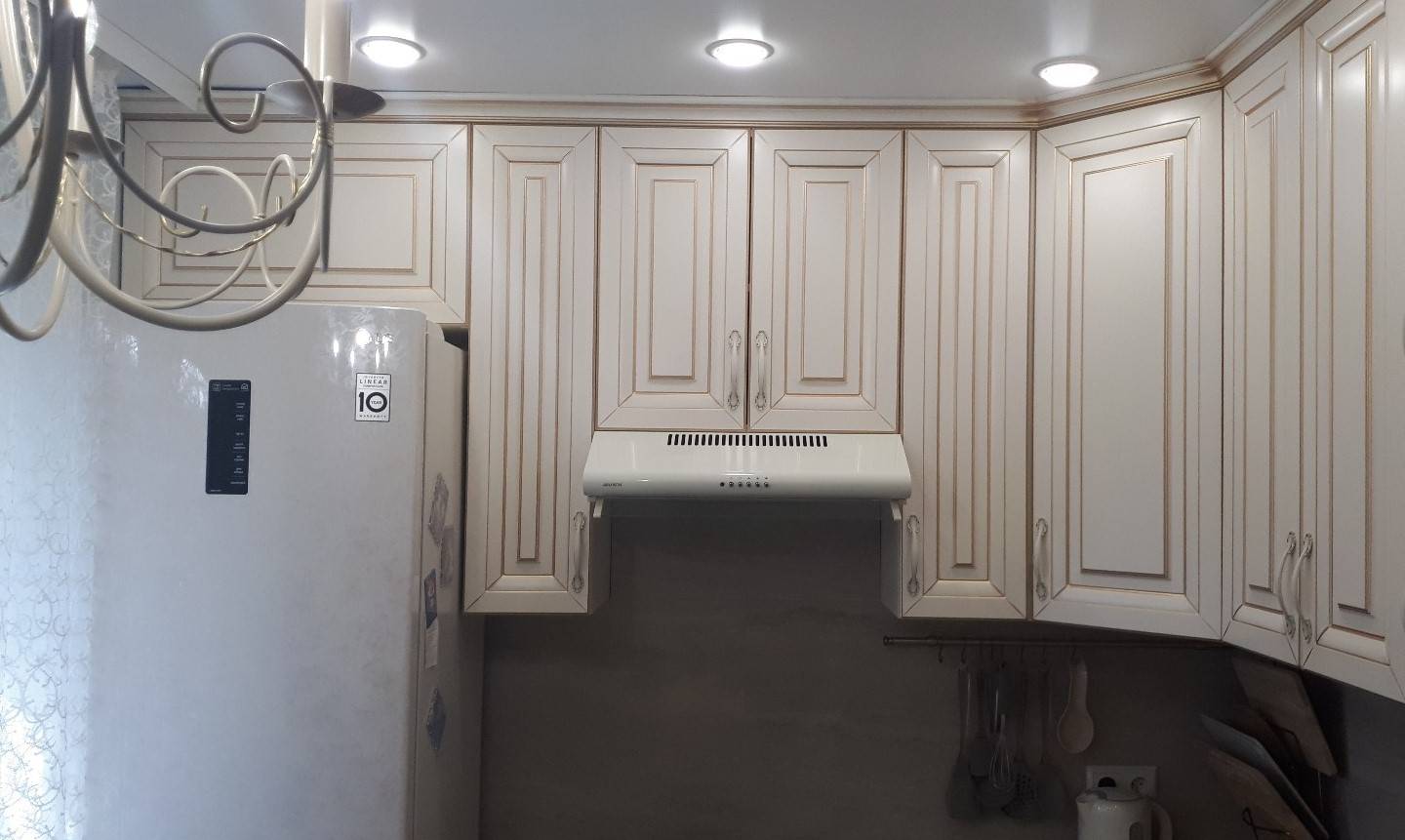 Хотите применить классику в типовой кухне хрущевки? Тут от крупногабаритной мебели придется отказаться. Впрочем, кто сказал, что бежевый угловой гарнитур выглядит плохо? Выбирайте модели с золотистой патиной на фасадах — они выглядят дорого и изысканно.