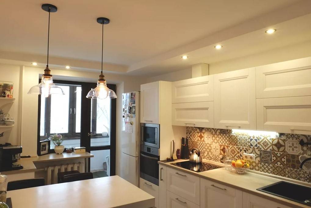 На потолке установлены точечные светильника, обеденная зона подсвечивается подвесными люстрами, а естественный свет беспрепятственно проступает сквозь окно.