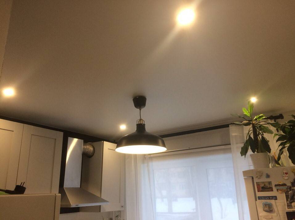 Их количество напрямую зависит от площади комнаты. Плоские светильники-тарелки фиксируются по центру, а небольшие споты — в местах, требующих подсветки. Например, рабочая или обеденная зона.