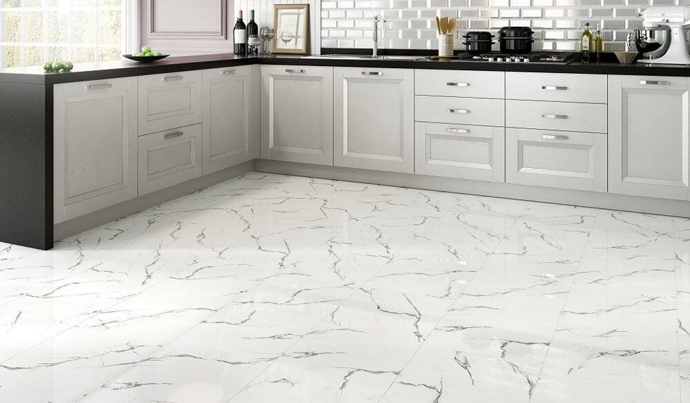 Немного разбавить стерильность основного цвета может пол и столешница в тон пола. Стены часто окрашиваются обычной краской или наклеиваются светлые обои с орнаментом.