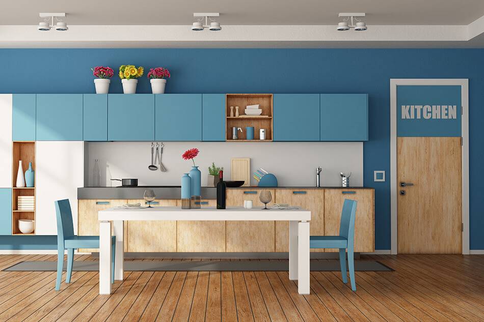 Синий – насыщенный и благородный цвет, который прекрасно подойдёт для оформления кухни. Однако стоит иметь в виду, что он утяжеляет предметы и имеет холодную температуру. Стоит использовать синий в просторных комнатах с окнами на юг, либо только в качестве акцента. Примеры красивых кухонь в синем цвете: