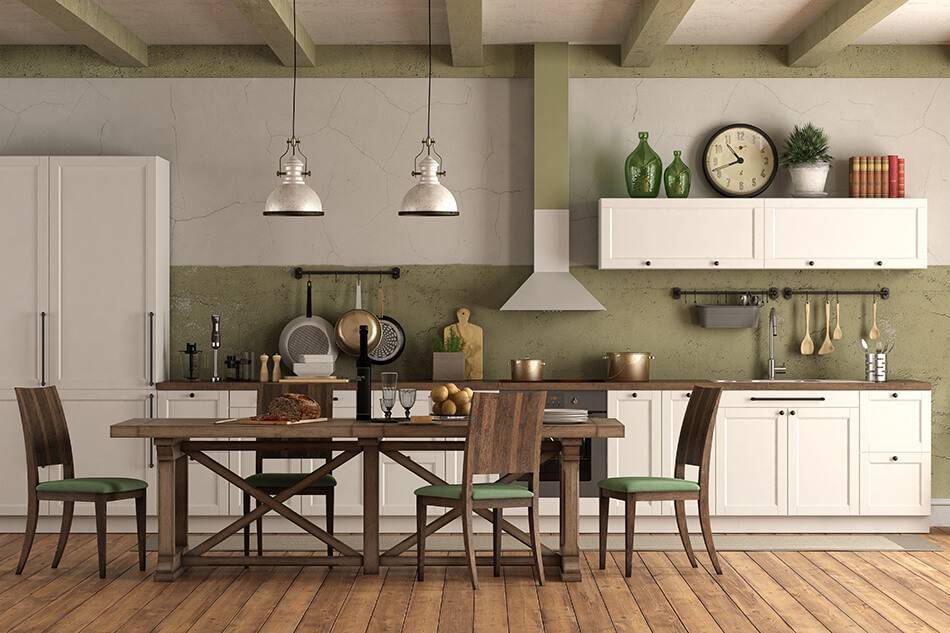 Зелёный – очень удачный вариант для кухни. Он свежий и близкий к природе, создаёт атмосферу гармонии и спокойствия. Так как зелёный является ненавязчивым, в оформлении его можно использовать в больших количествах. Вдохновитесь примерами: