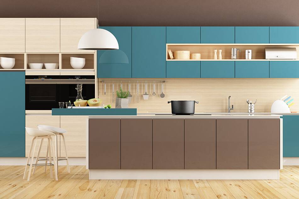Современные кухни в стиле модерн удобны и практичны, так как бытовая техника встраивается в мебель, а лишние детали просто отсутствуют. Зато цветовая гамма стиля позволяет развернуться любой дизайнерской идее: здесь приветствуются самые неожиданные сочетания — белый и синий, салатовый и бордо.