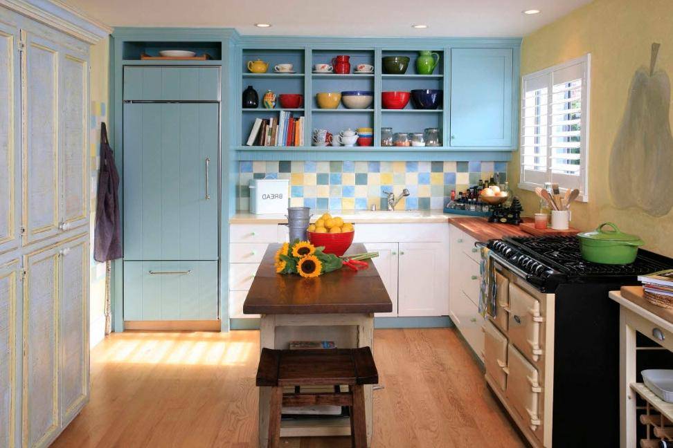 Синий цвет и его оттенки часто используются при оформлении кухонь Прованском стиле. Голубой оттенок используется как в качестве цветового решения фасадов, так и для отделки локальных вертикальных поверхностей. Символизируя южное небо, этот цвет прекрасно сочетается с другими природными оттенками — белым, коричневым, песчаным. В синем цвете видны прохлада морского бриза и миролюбие неба, но этот цвет также должен использоваться разумно. Если ваша кухня расположена в северной части здания, вам лучше оставить синий цвет для посуды и кухонной техники.