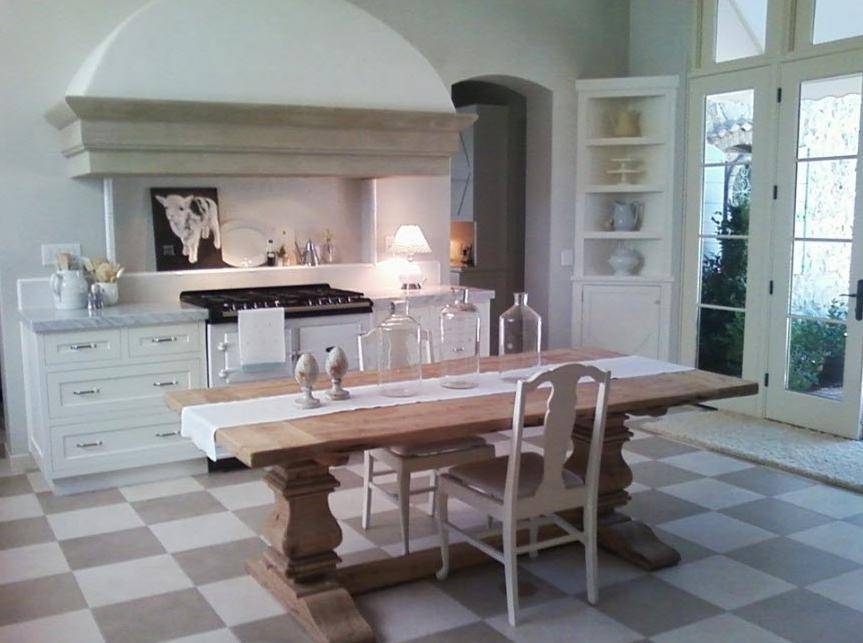Для французского кантри характерно, что пол разных зон кухни, совмещенной с гостиной, не должен сильно отличался по цвету или текстуре – и этого легко добиться при помощи имитирующих материалов.