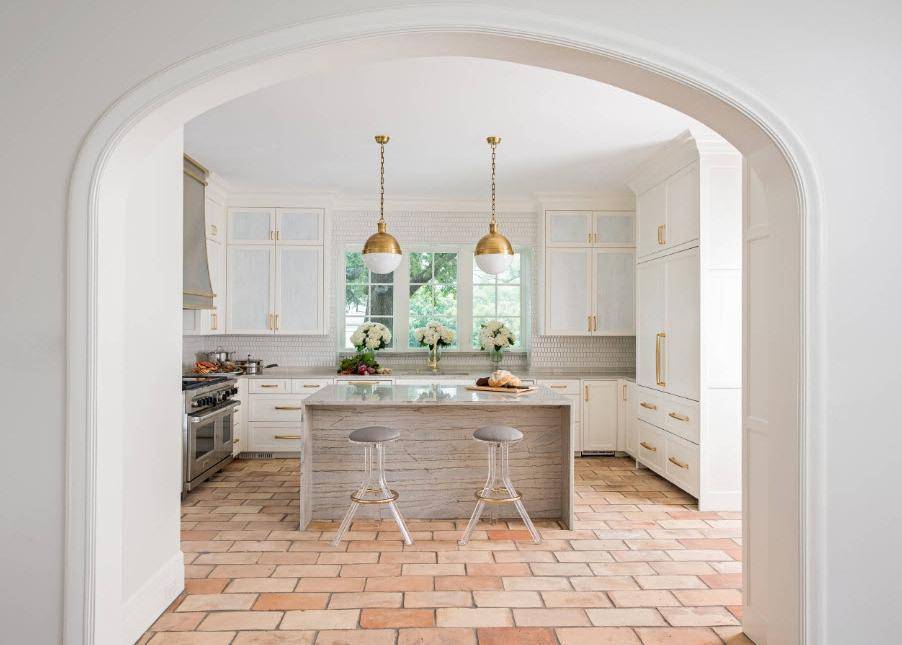 Не всегда можно позволить себе длинный стол в обеденной зоне, отмечающий центром провансальской кухни. Решением этой проблемы часто оказывается остров, который одновременно выступает в качестве рабочего пространства и места для хранения. Столешницы из натурального камня являются эффективным дополнением провансальского стиля на кухне. Они характеризуются не только исключительной декоративностью, но и высокой прочностью. Бывают двух вариантов: матовые и полированные.