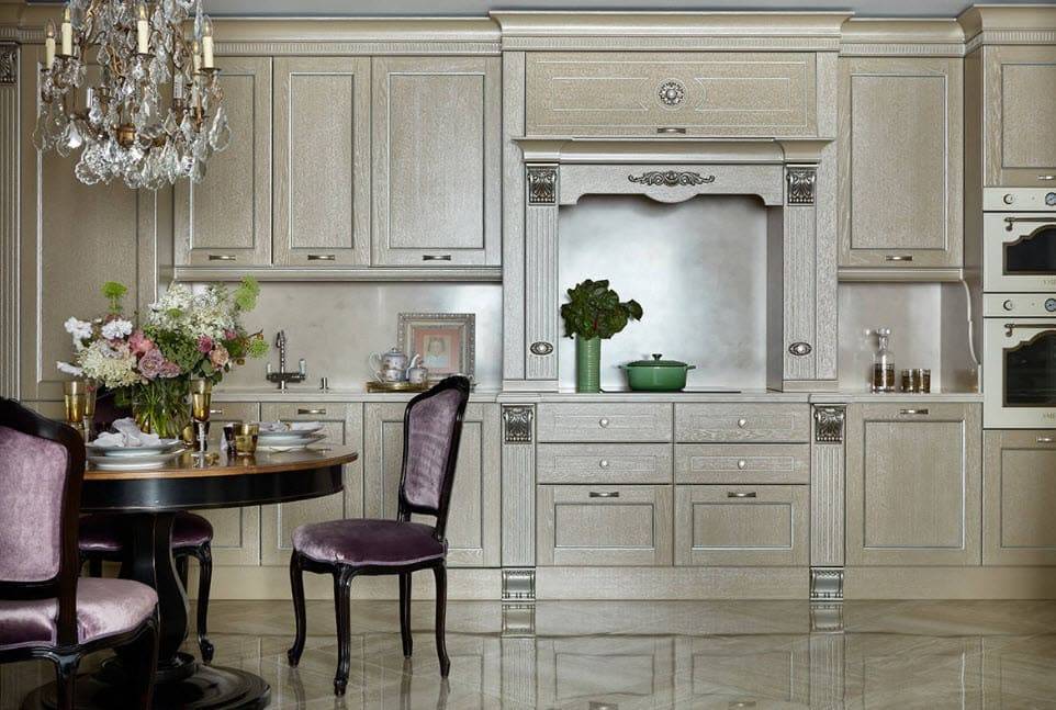 Недорогие синтетические материалы способны «удешевить» кухню, и превратить ее в обычное затрапезное помещение с банальным «евроремонтом». Подчеркнуть изящество и элегантность классического интерьера кухни поможет изысканный декор поверхностей: лепнина, позолота, резьба. Обстановка должна быть благородной и торжественной.