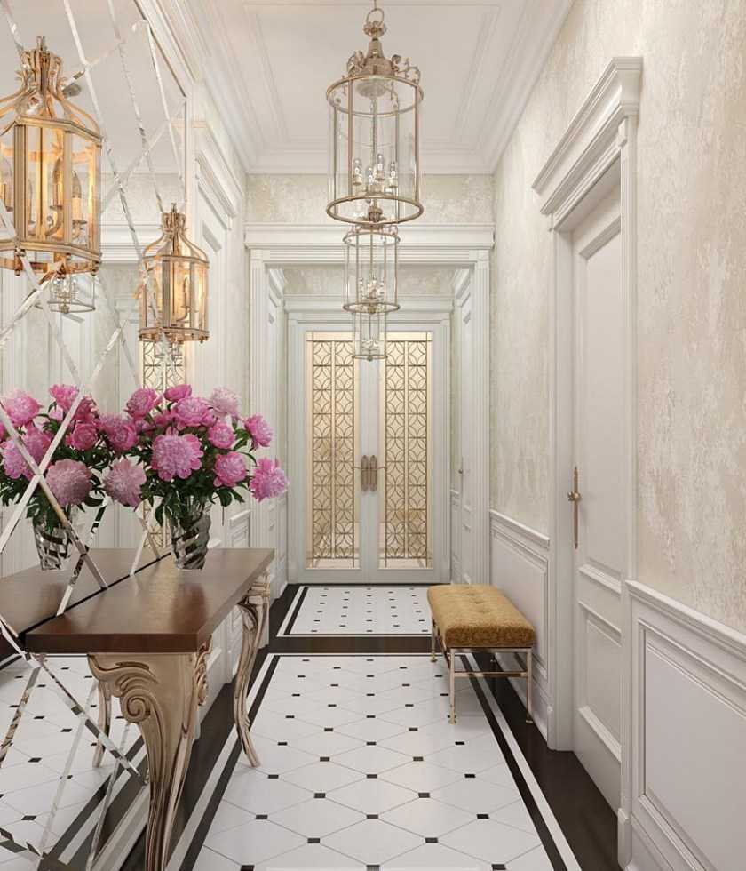 Дизайн квадратной прихожей часто оформляют в классических стилях.
