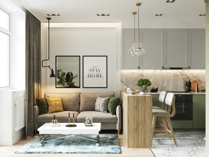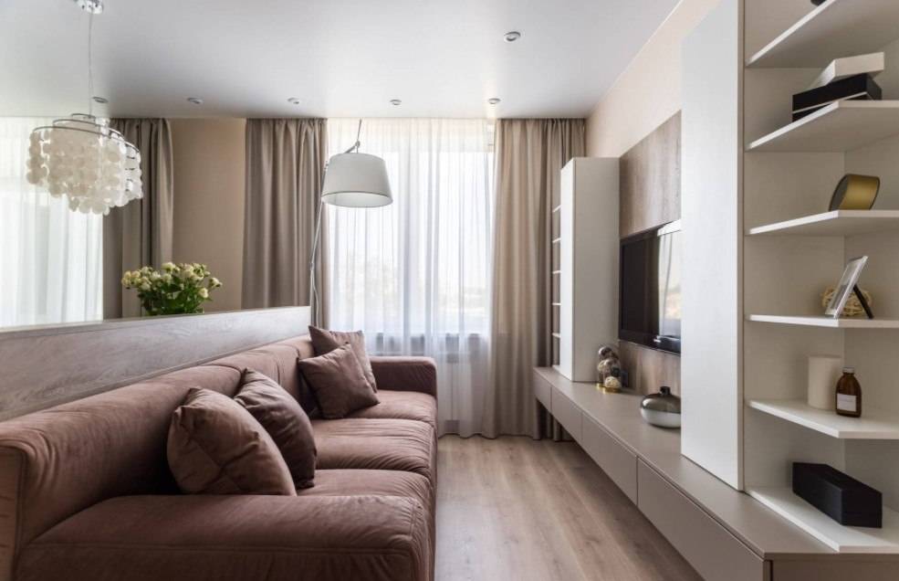 Определи функциональные зоны и грамотно размести их! В малогабаритных квартирах зачастую гостиная играет одновременно роль спальни, кабинета или совмещена с кухней. Поскольку установить перегородку у тебя наверняка не получится из-за небольшой площади, используй для зонирования мебель и отделочные материалы.