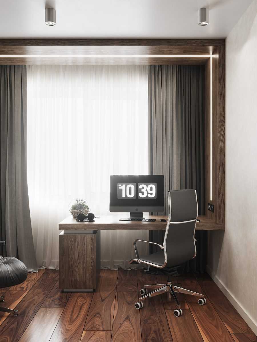 Помещение делят на рабочую часть и зону отдыха. Преимущественно используют предметы из металла, дерева и стекла. Обилия пластика лучше избегать, если этого не требует стилистика интерьера. Дополнить комнату можно библиотекой. Общие правила: