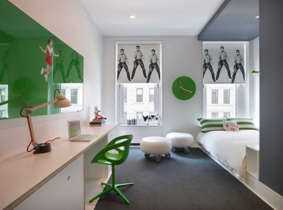 Но строгих ограничений на другие оттенки нет. Здесь все индивидуально. Романтичной девушке вряд ли захочется иметь черно-белую комнату даже с одним — двумя яркими аксессуарами. А вот мальчика подростка такой интерьер может порадовать. Хорошо смотрится сочетание зеленого с белым или коричневым.