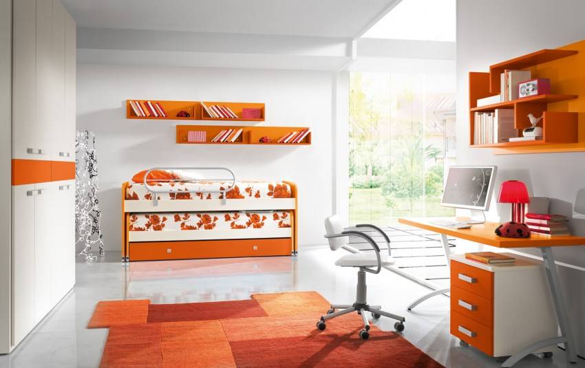 У одной стены организовывается спальная зона. Место между полом и кроватью часто рационально используется для хранения некоторых вещей. Под кроватью могут быть установлены выдвижные ящики. Рабочая зона расположится у окна. Для системы хранения вещей и экономии площади можно воспользоваться угловыми мебельными конструкциями, шкафами, полками, учебными уголками. Если в комнате проживают двое детей, хорошим решением станут складные, выдвижные или откидные столики для учебных занятий. На стенах, над окнами, дверями дополнительно устанавливаются полки. Декором послужат подушки, покрывала с принтами, узорами или изображениями и фотографии в симпатичных рамках.