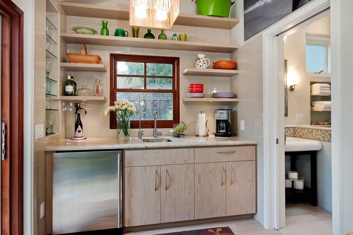 6. В миниатюрной кухне старайтесь использовать любое пространство, удобное для монтирования мебели. В этих целях отлично подойдут навесные угловые шкафы и открытые полки, над которыми хорошо будет организовать точечное освещение.