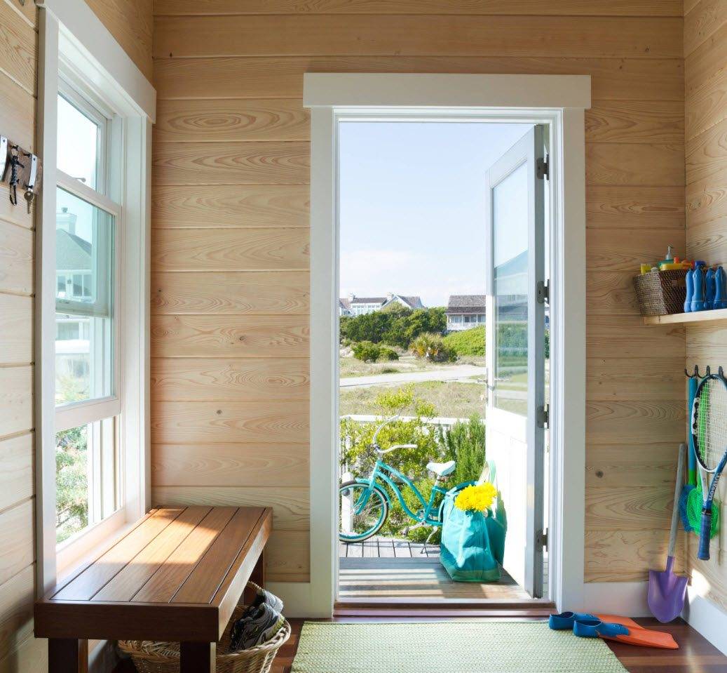 В частных домах дизайн-проект прихожей может включать окна. Они помогают значительно увеличить пространство, не создавая вид замкнутости. Формы, а также размеры их разнообразны: это могут быть маленькие проемы нестандартных форм, оформленные витражами, большие стеклопакеты от пола до потолка, создающие эффект стеклянной галереи или же окна обычных средних размеров. Дизайн прихожей с окном оформляется соответственно общей стилистики дома: витражи подчеркнут стили модерн, винтаж, лофт, прозрачные стеклопакеты – минимализм, хай тек.