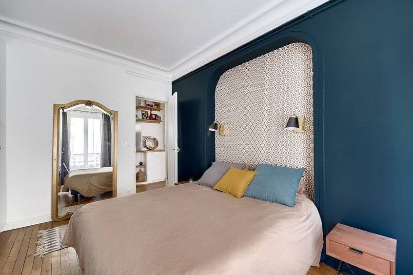 Изголовье кровати можно оформить с помощью яркого цвета, сделав его тем самым акцентом в маленькой спальне. Можно обойтись и без изголовья, выделив заднюю стену с помощью обоев с принтом или тканевых панелей. Здесь уже кому как нравится.