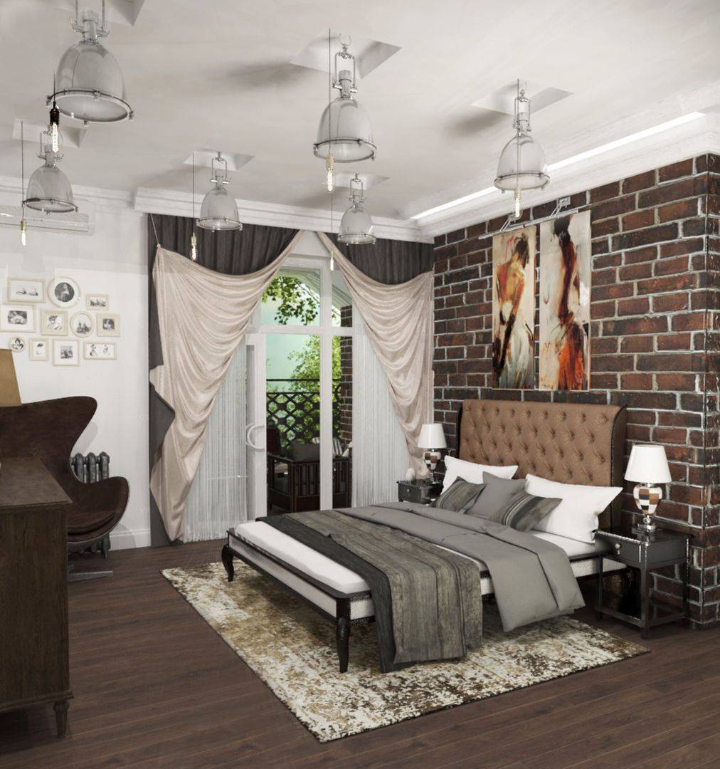 Например, можно объединить классику и лофт. Чтобы оформление спальни 9 кв.м. не выглядело странно и пестро, сочетай близкие в цветовом спектре оттенки, при этом общий фон лучше окрась в светлый цвет.