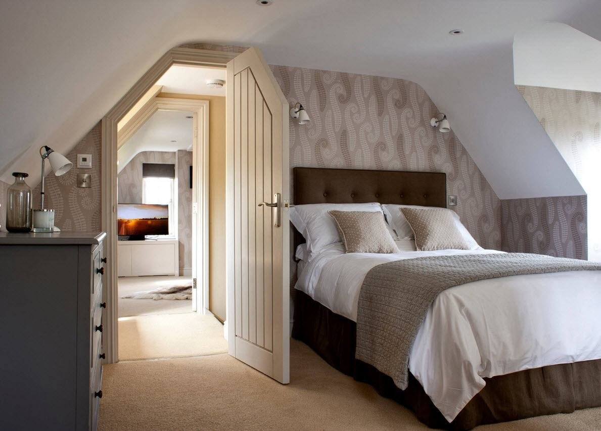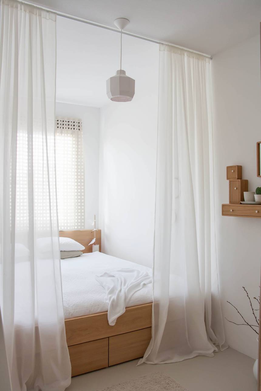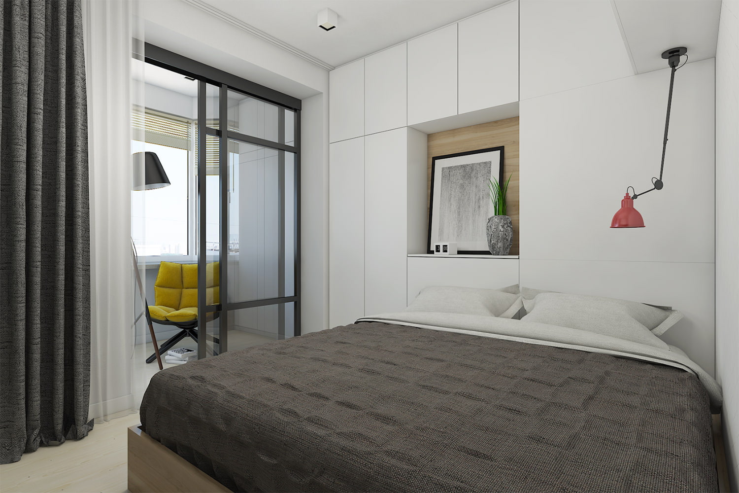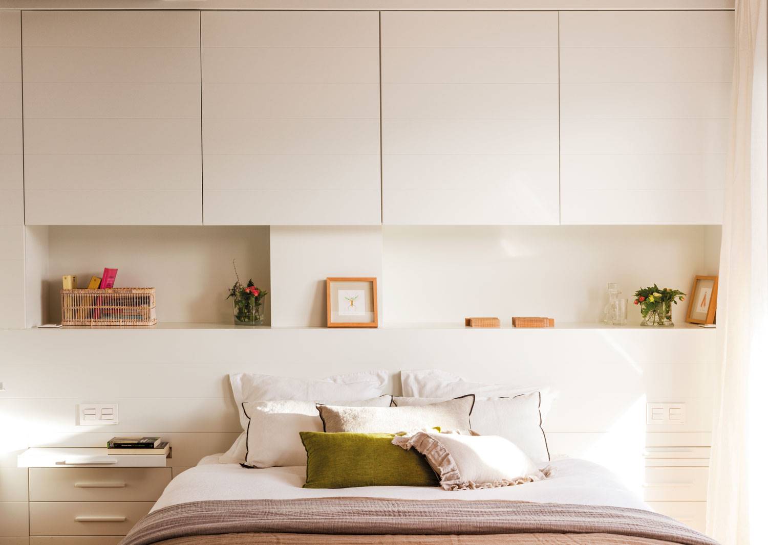 Изголовье также может быть оптимизировано, так как это помогает избежать использования громоздких тумбочек. Секрет обустройства интерьера маленькой спальни-оптимизация пространства по высоте и углам комнаты. Пространство над дверью также является решением, когда комната действительно маленькая.