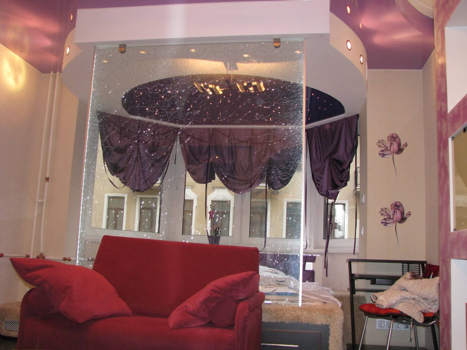Но совсем без занавесок комната выглядит не совсем уютно и стильно. Поэтому следует выбрать легкие воздушные ткани светлых или нейтральных цветов, можно прозрачные.