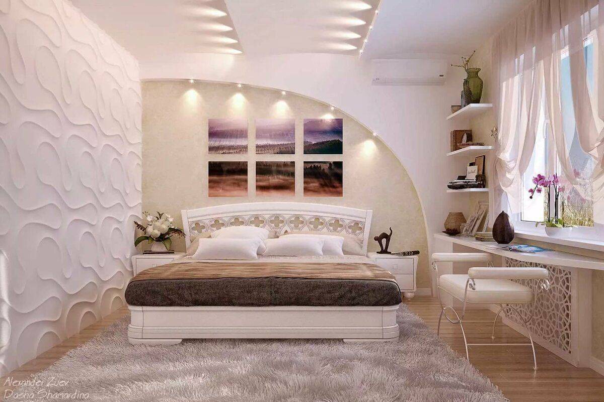 Кстати, изголовье кровати можно обозначить с помощью полки вдоль всей стены, которую использовать вместо прикроватных тумбочек. Подобная конструкция создается из гипсокартона.