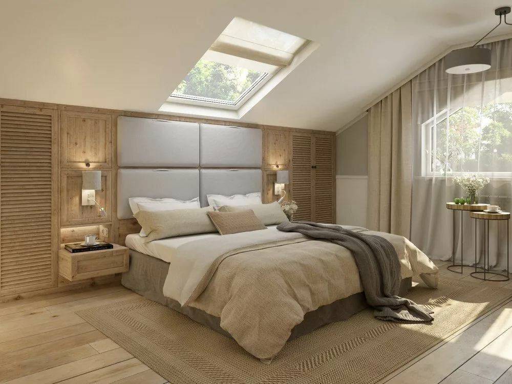 Остановись на светлых вариантах для занавесок и отделки стен. При этом стену над кроватью можно украсить деревянными панелями и картиной – это добавит интерьеру спальни свежести и непринужденности.