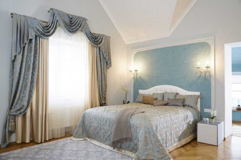Обстановку дополнят настенные бра, торшер, люстра. У изножья можно разместить небольшую, но изящную банкетку. На окна обязательно вешают красивые шторы, а кровать застилают богатым покрывалом. Ковёр на полу станет завершающим штрихом.