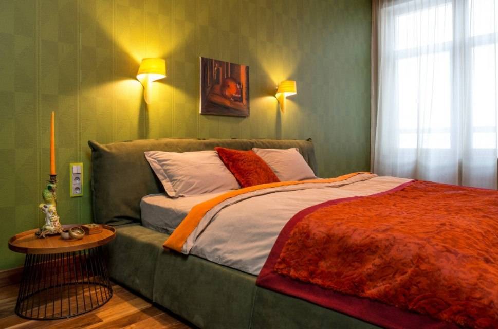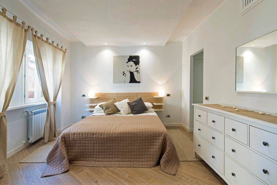 Акценты размещаются в изголовье кровати или рядом с ней. К примеру, это может быть необычная декоративная спинка или оригинальное покрывало. Остальную мебель хозяева могут выбирать по своему усмотрению, но при этом помнить, что обстановки не должно быть много.