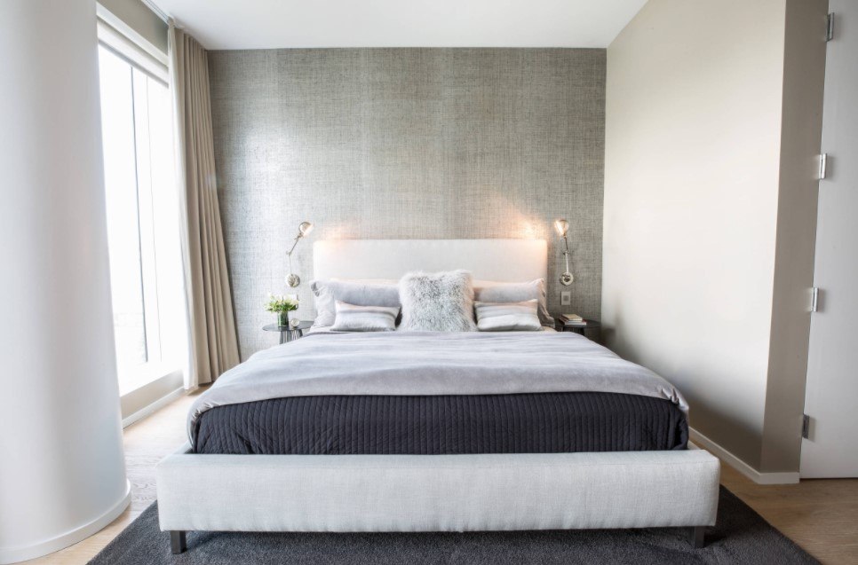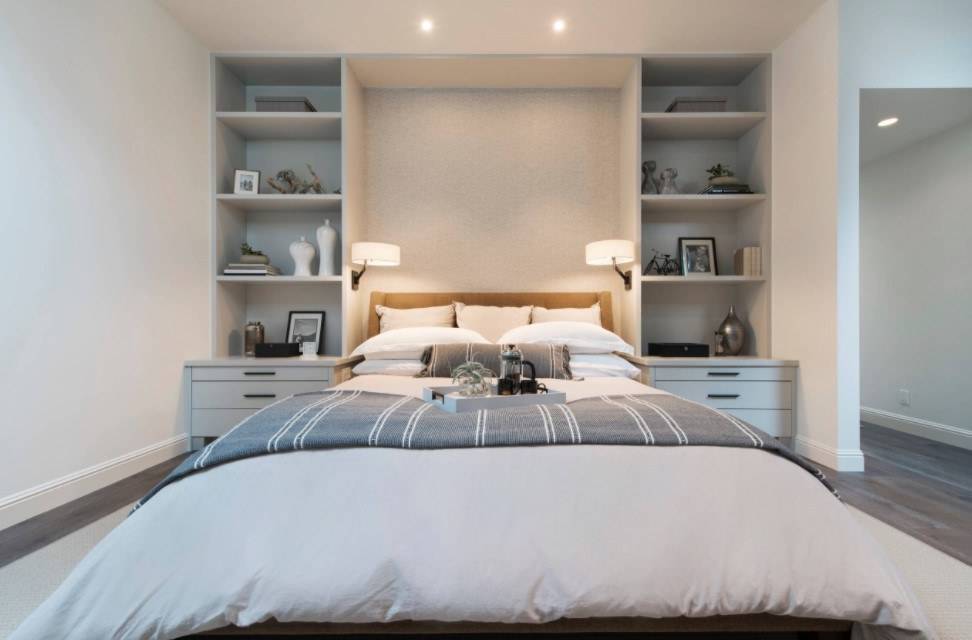 Важно не оставить никаких зазоров, поскольку это будет смотреться не эстетично. Если вы решили поставить в комнате прикроватные тумбочки, то они не должны возвышаться над кроватью