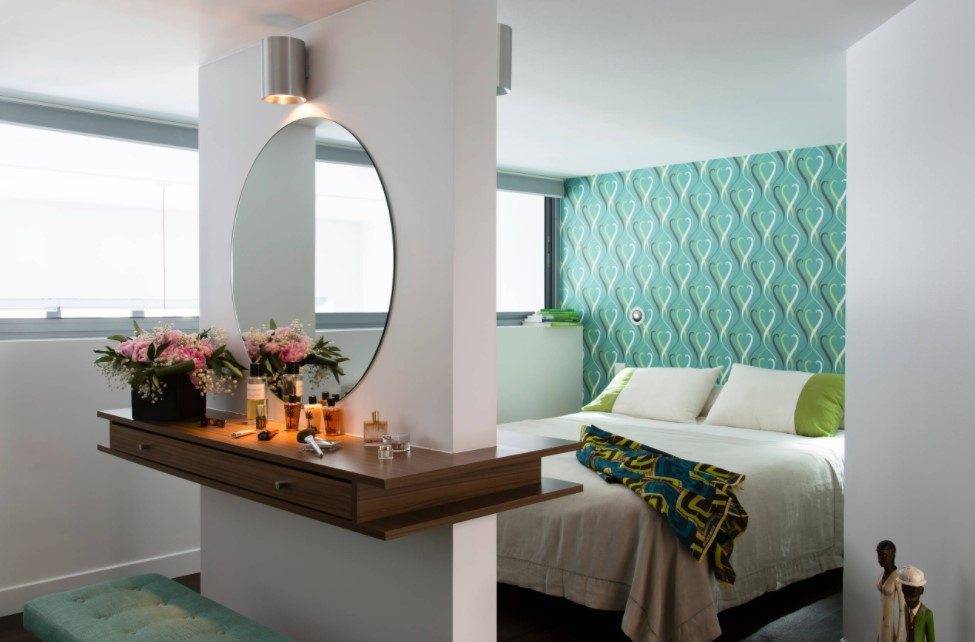 - встроенный зеркальный шкаф, который расширит пространство и в тоже время позволит хранить необходимые вещи. Шкаф-купе станет отличным решением для небольшой комнаты;