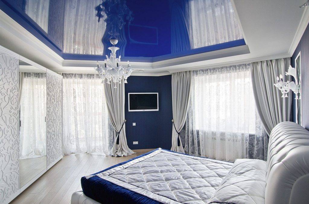 Глянцевый натяжной потолок синего цвета в спальне