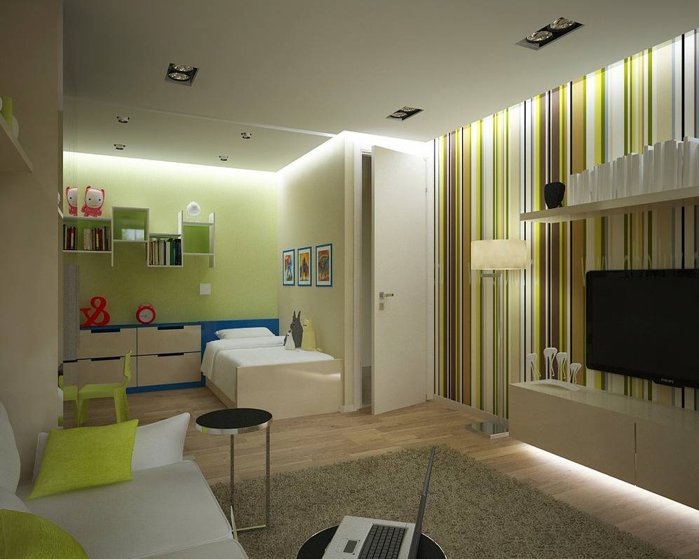Детская зона — теплая, функциональная, наполненная светом часть комнаты. Устанавливаются предметы типа трансформер, оригинальные шкафы, полки. Хорошо подойдет раскладное кресло или диван. Они легко трансформируются в удобное спальное место. Выделить зону можно обоями, на которых нанесен детский орнамент. Здесь кроха будет себя чувствовать комфортно, с интересом рассматривать рисунки на стенах.
