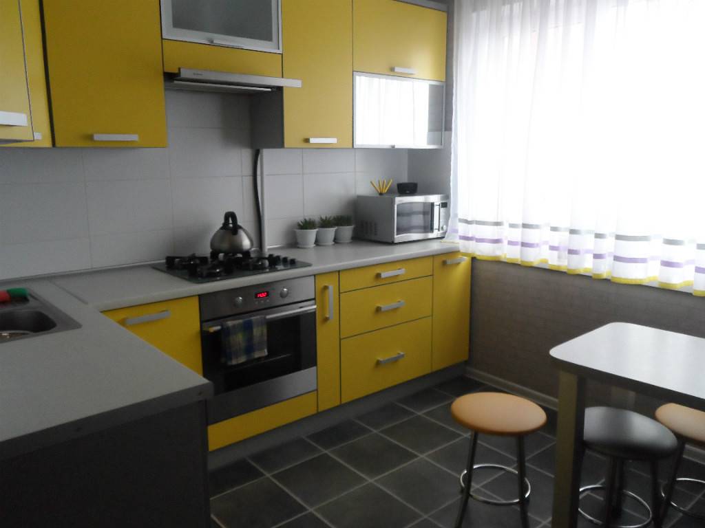Наиболее популярный вариант линии между кафельным участком пола и ламинатом — прямая. Если кухонная мебель находится в своеобразном «кармане» помещения, то лучше выполнить переход по уже имеющейся линии. Если мебельный фасад находится вдоль длинной стены, стыковку рекомендуется делать параллельно линии кухни на расстоянии 1-1,5 м от нее.