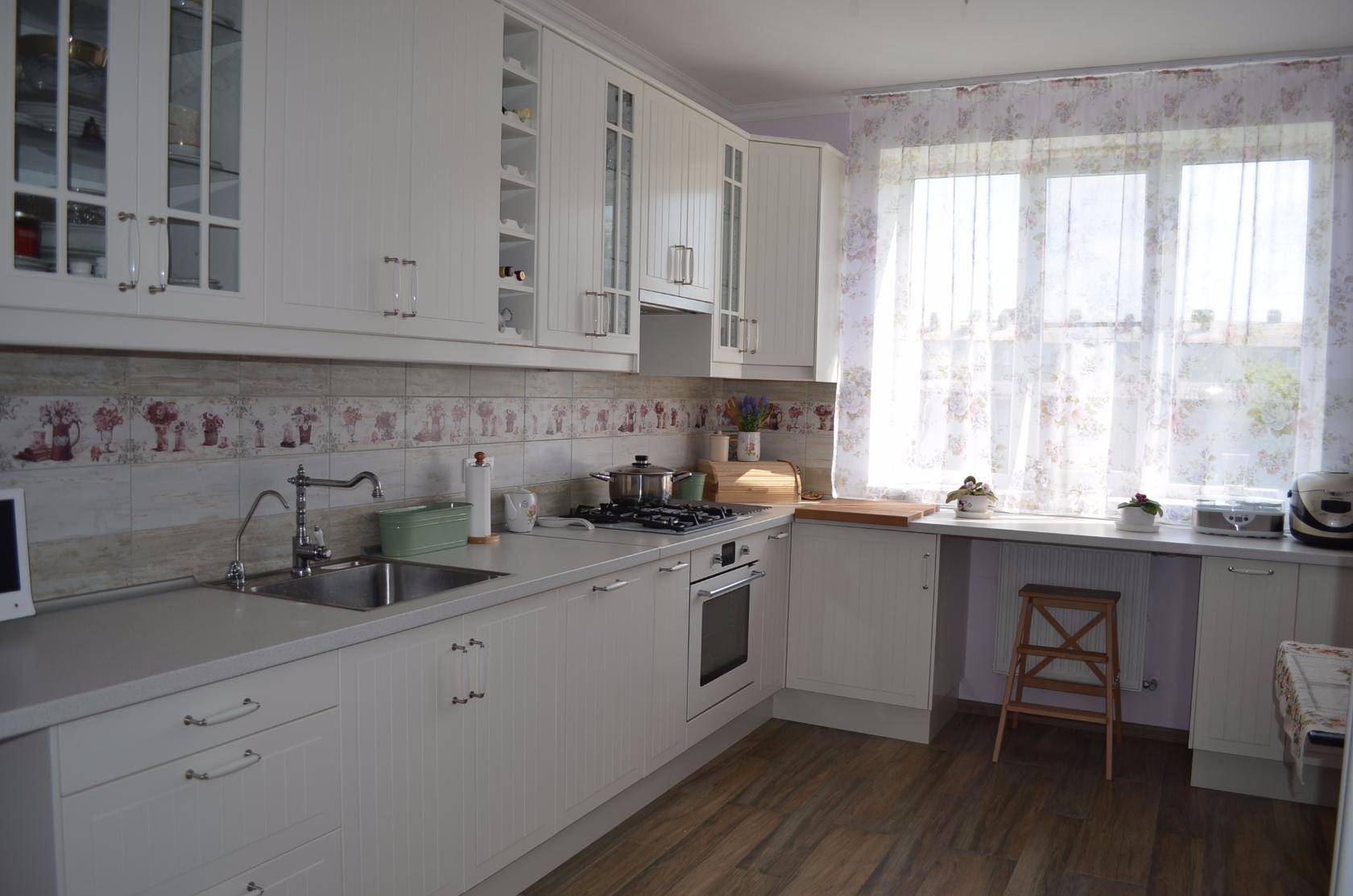 Прежде чем приступать к покупке материалов для ремонта, определяются с цветовыми сочетаниями кухонного гарнитура, плитки и ламелей. Легче всего подобрать сочетание для мебели светлых оттенков. Белый, кремовый или бледно-коричневый гарнитур удачно компонуется практически с любой светлой плиткой теплых тонов. При таком варианте дизайна ламинат выбирают обязательно из темной или красно-коричневой группы оттенков.