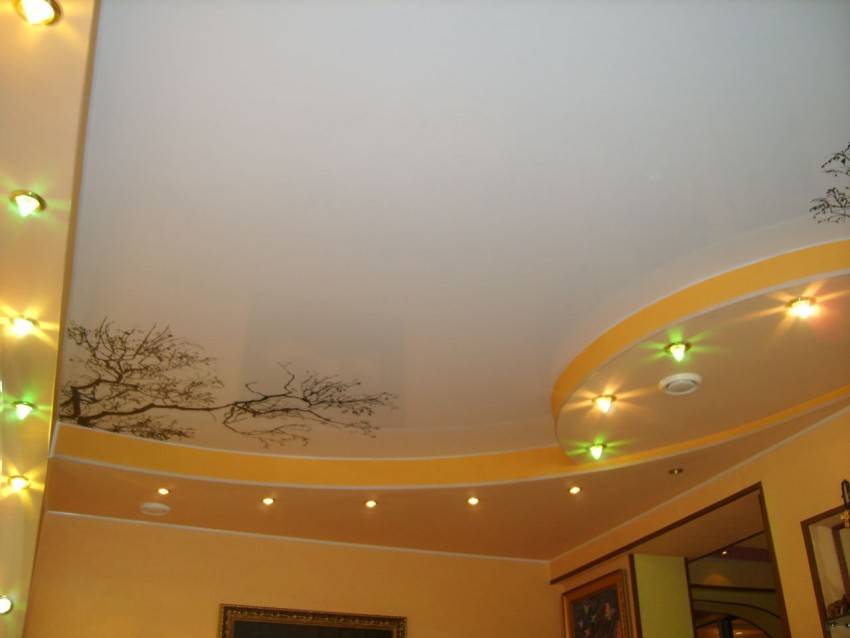 Благодаря технологиям фотопечати на пленку можно перенести абсолютно любое изображение. Это и аккуратный декоративный орнамент по периметру, и облака или звездное небо, и даже целые фотографии цветов либо природы. Чаще всего фотопечать используется не на весь потолок, а для каких-то отдельных элементов многоярусных конструкций.