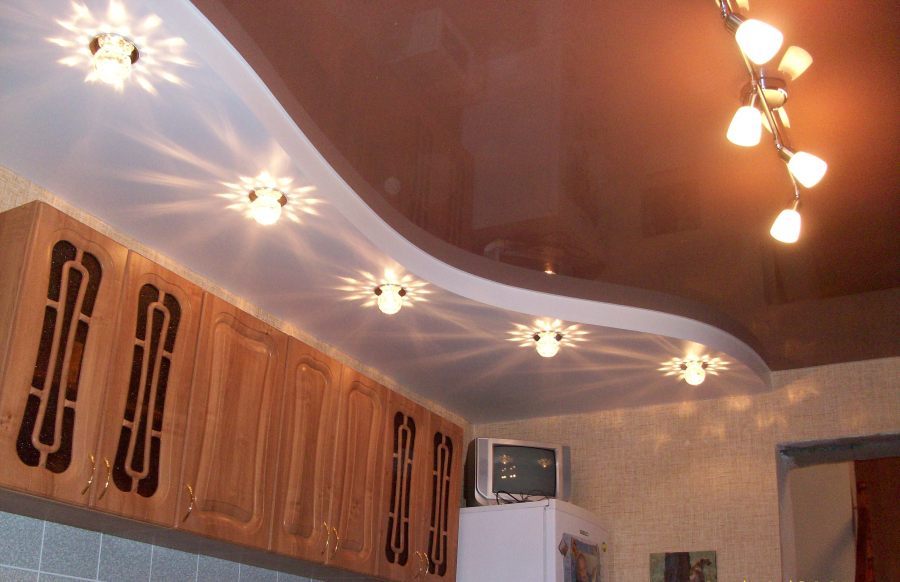 Независимо от выбранного способа, поверхность получится очень ровной. В такой потолок можно встроить точечные светильники. С их помощью можно и просто осветить кухню, и зонировать ее. Например, над обеденной зоной сделать основное освещение, а над рабочей зоной установить подсветку, что значительно повысит комфорт хозяйки в процессе приготовления пищи.