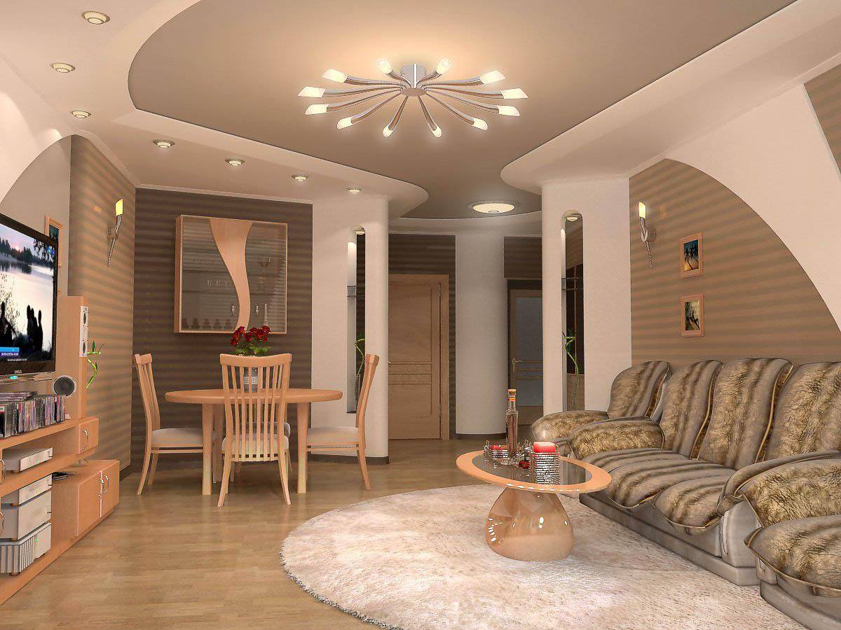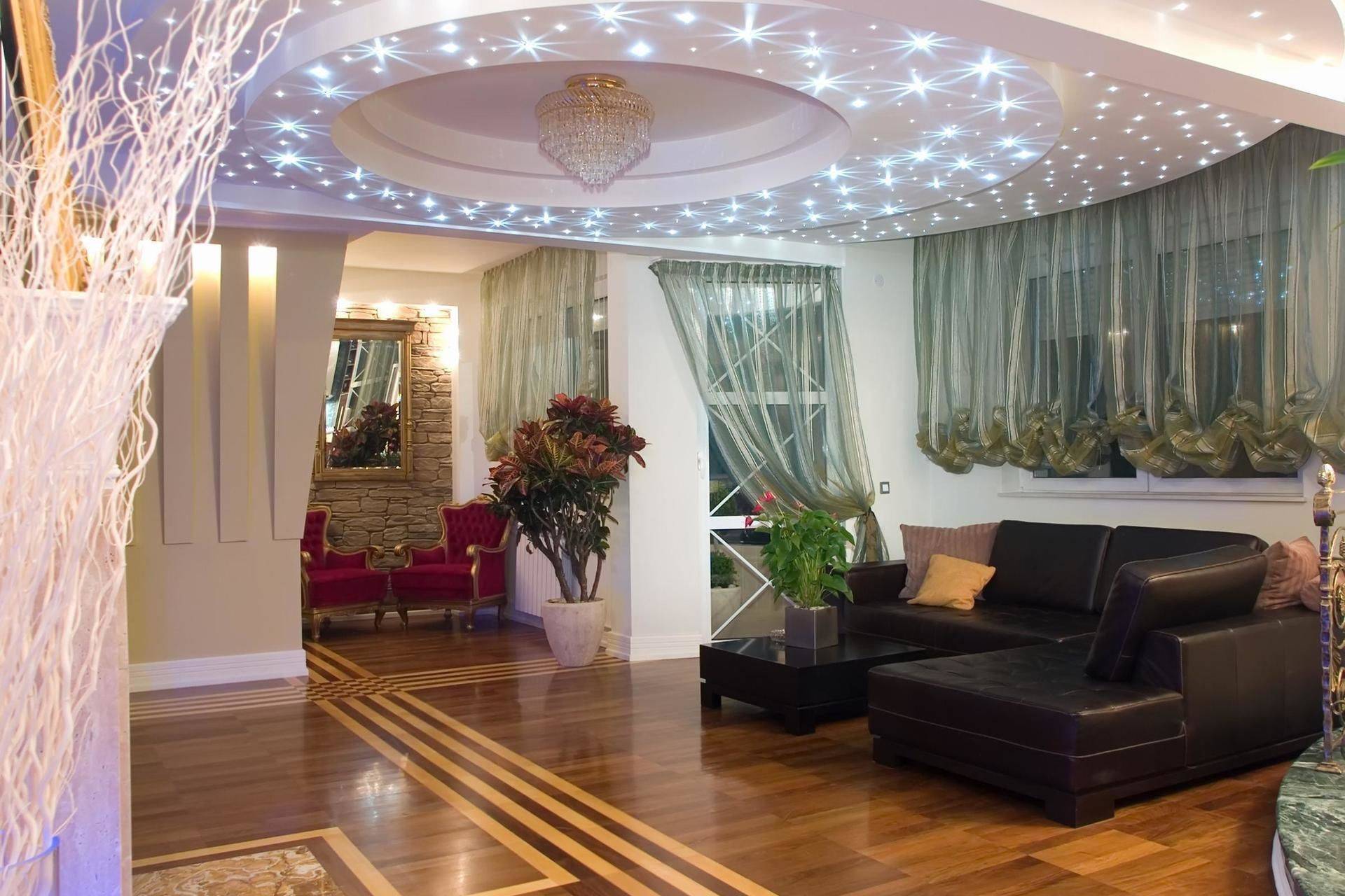 Благодаря подвесному или натяжному потолку в гостиной можно получить неординарный характер освещения интерьера, особенно если поверхность выполнена в нескольких плоскостях и совмещена с эффективными точечными лампами. С помощью подвесных потолков из гипсокартона или фибро-гипсокартона можно также формировать скосы, арки и аркады.