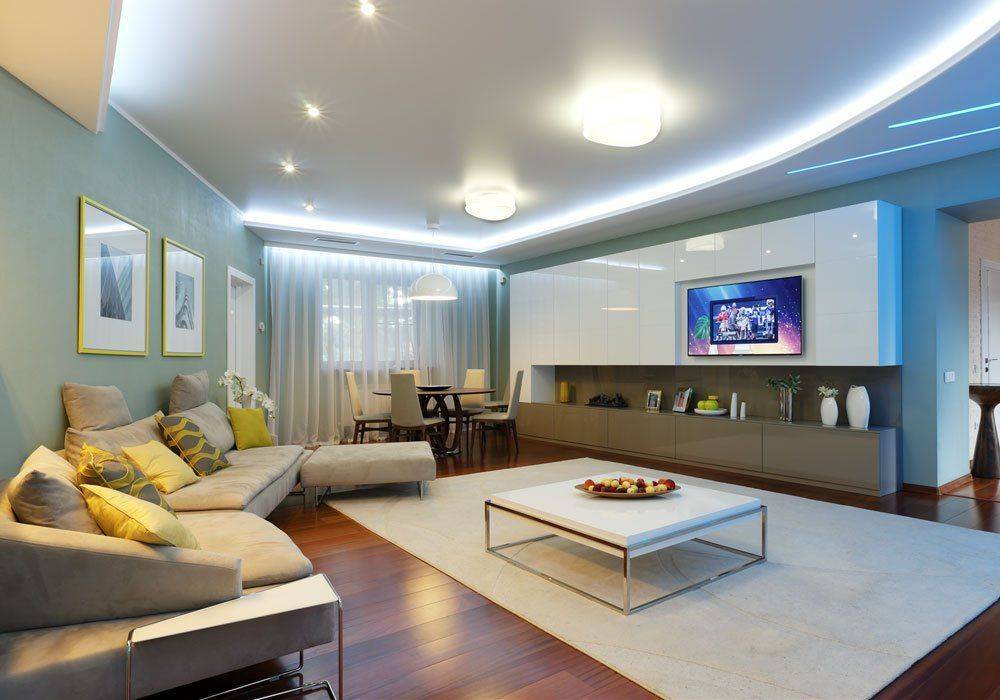 При выборе цвета потолка в гостиной следует помнить о том, что цвет может оказывать ощутимое влияние на самочувствие и настроение человека, так что к этому нужно отнестись ответственно. В гостиной жильцы квартиры проводят много времени, здесь принимают гостей и отдыхают сами или всей семьей. Это главная комната в квартире, которая должна быть уютной и обладать нераздражающим интерьером. Лучше всего остановиться на ясных, спокойных, средней насыщенности цветах. Теплые или холодные они будут, зависит от личных предпочтений и освещения комнаты в дневное время.