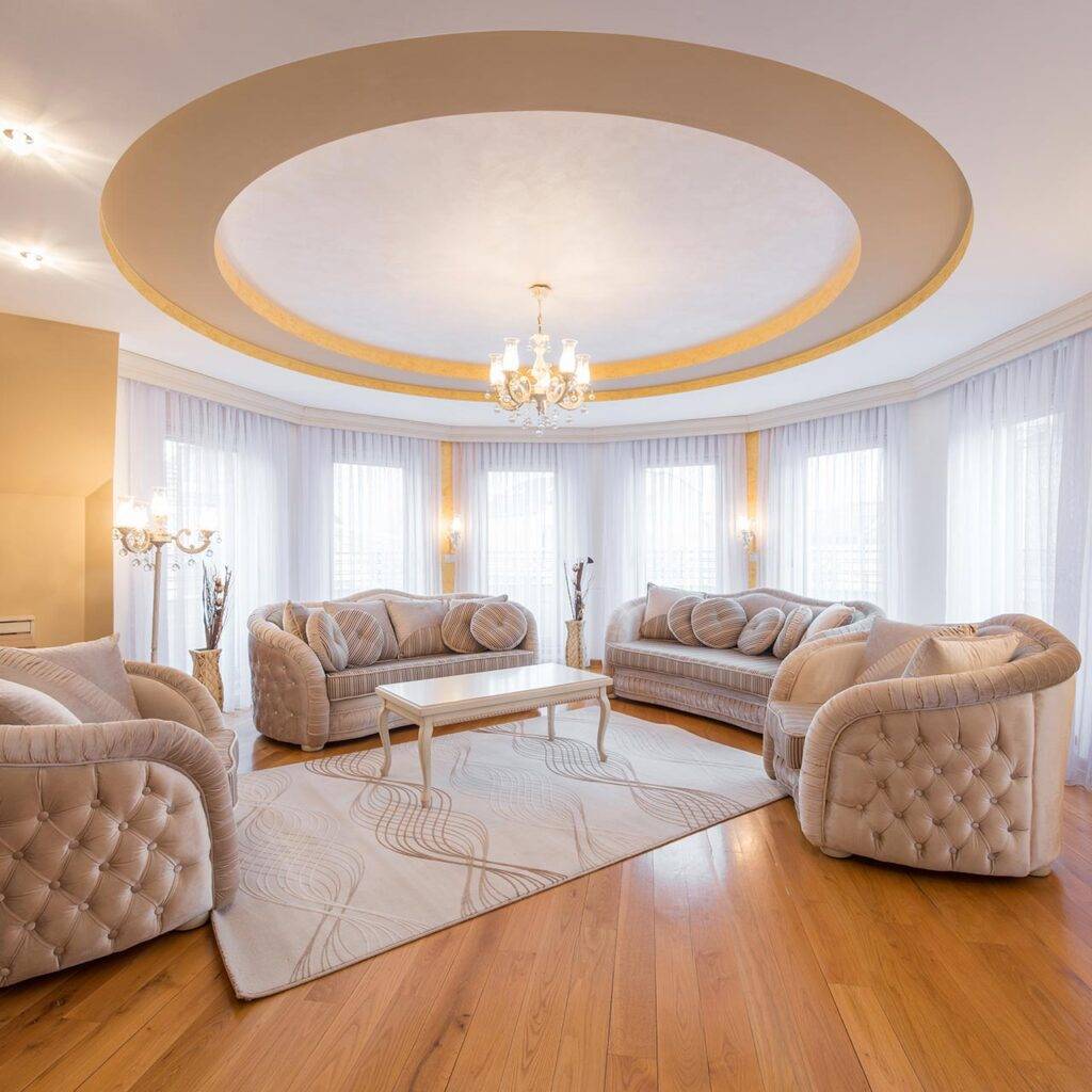 Во вторую группу входят классический, неоклассический, английский, итальянский стили. В этом случае обязательно наличие лепнины или ее имитации. В зависимости от высоты потолки могут быть многоуровневыми или простыми.