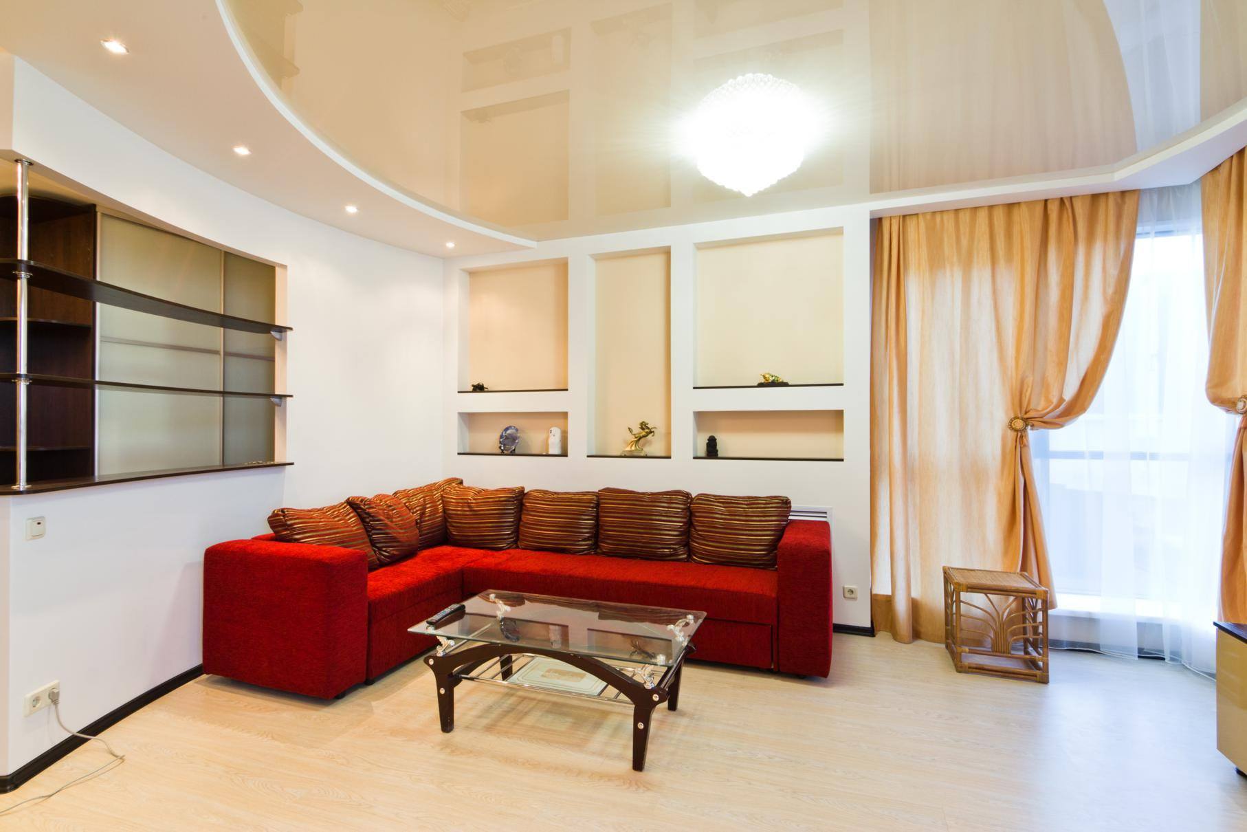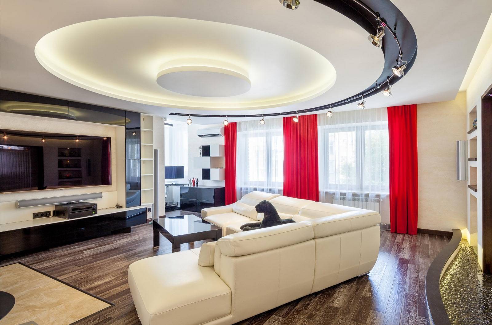 Остановив выбор на многоуровневой конструкции, попробуйте использовать её для зонирования зала. Для этого достаточно создать на перекрытии объемную фигуру или поэкспериментировать с цветом. Выбирайте глянцевые или зеркальные решения, если вам кажется, что потолок расположен недостаточно высоко.
