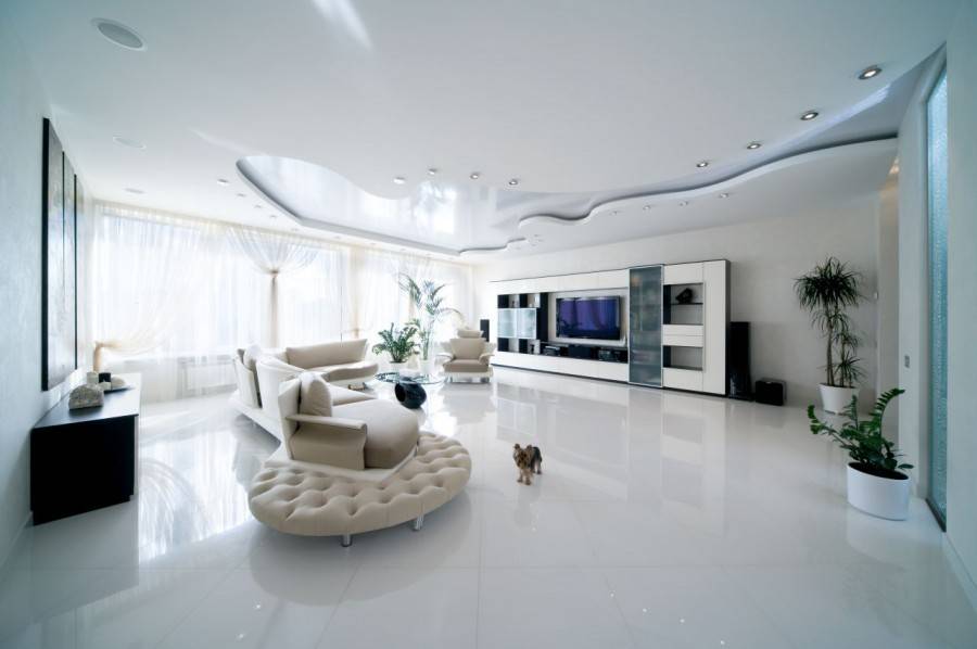 При выборе подходящей отделки вариантов – масса. Найти современное решение можно для зала, оформленного в любом стиле интерьера и имеющего различные размеры. Условно потолочные конструкции делятся на одно- и многоуровневые.