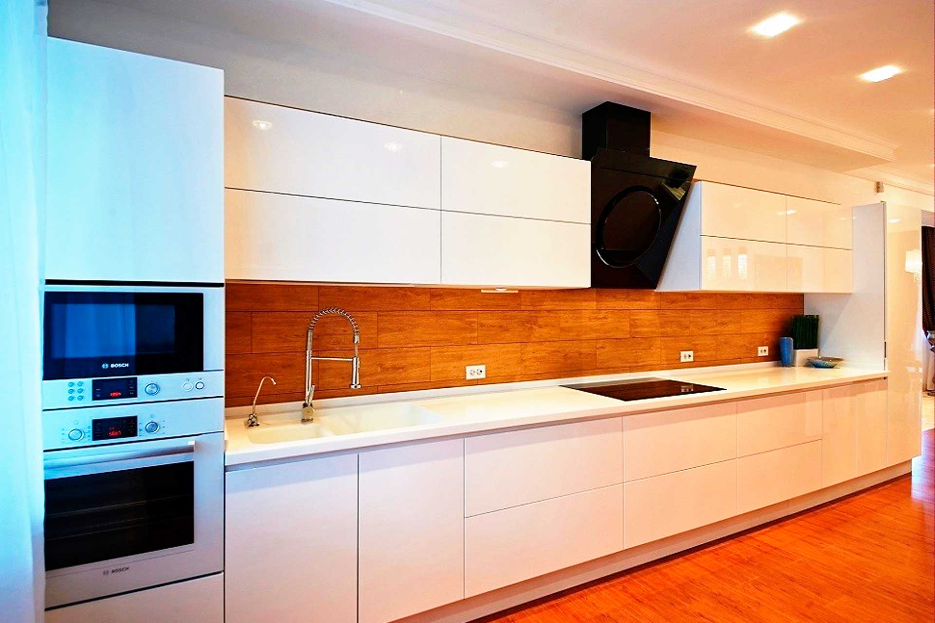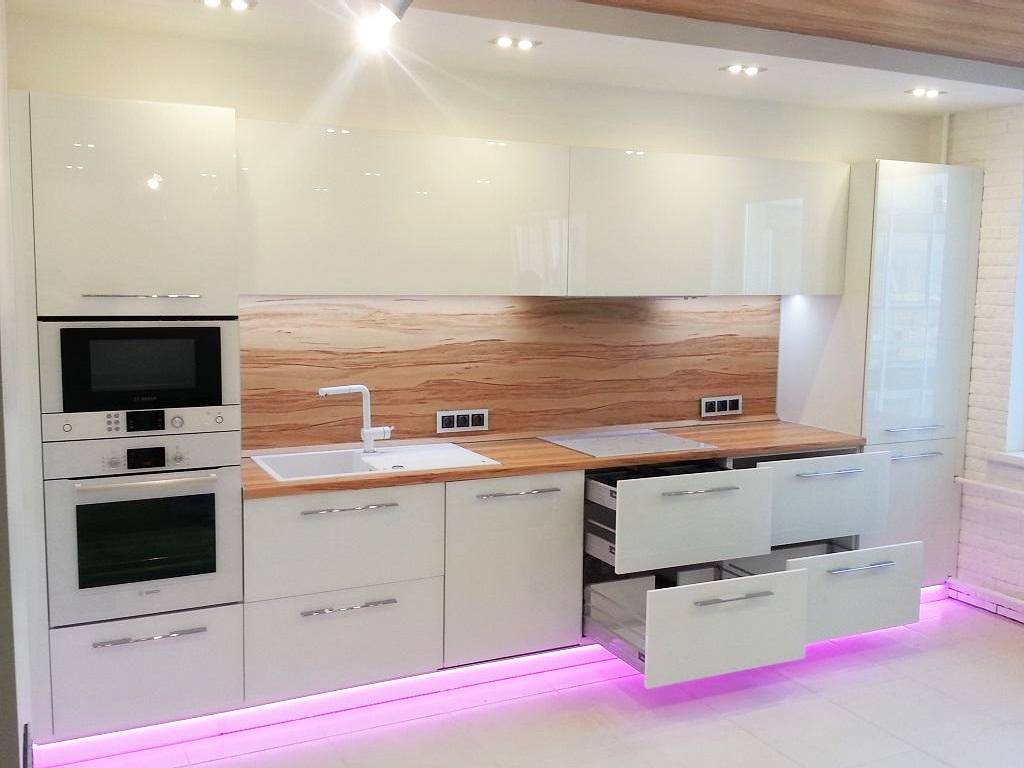 В нем можно устанавливать гарнитуры с глянцевыми поверхностями. Фасады часто украшены вставками других материалов: на деревянных шкафчиках ставят стеклянные двери, металлические ручки, ножки из металла или пластика под металл.