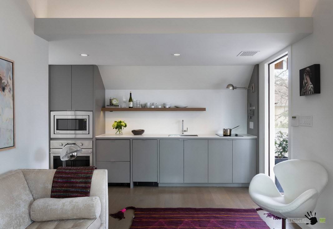 Единственный минус: сложность встраивания бытовых приборов. Возможно, классическую плиту с духовкой вам придется заменить на варочную панель. Но если вы не фанат выпечки, такая оптимизация пространства придется вам по душе.