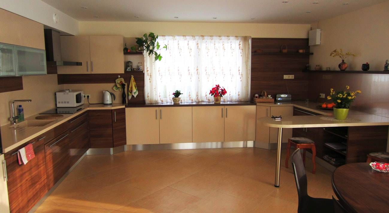 Такой вариант позволяет даже в очень маленькой кухне без труда разместить всю необходимую технику и мебель, создать удобное пространство для готовки с большой рабочей поверхностью. Но есть и недостатки – места для нормального обеденного стола остается мало.