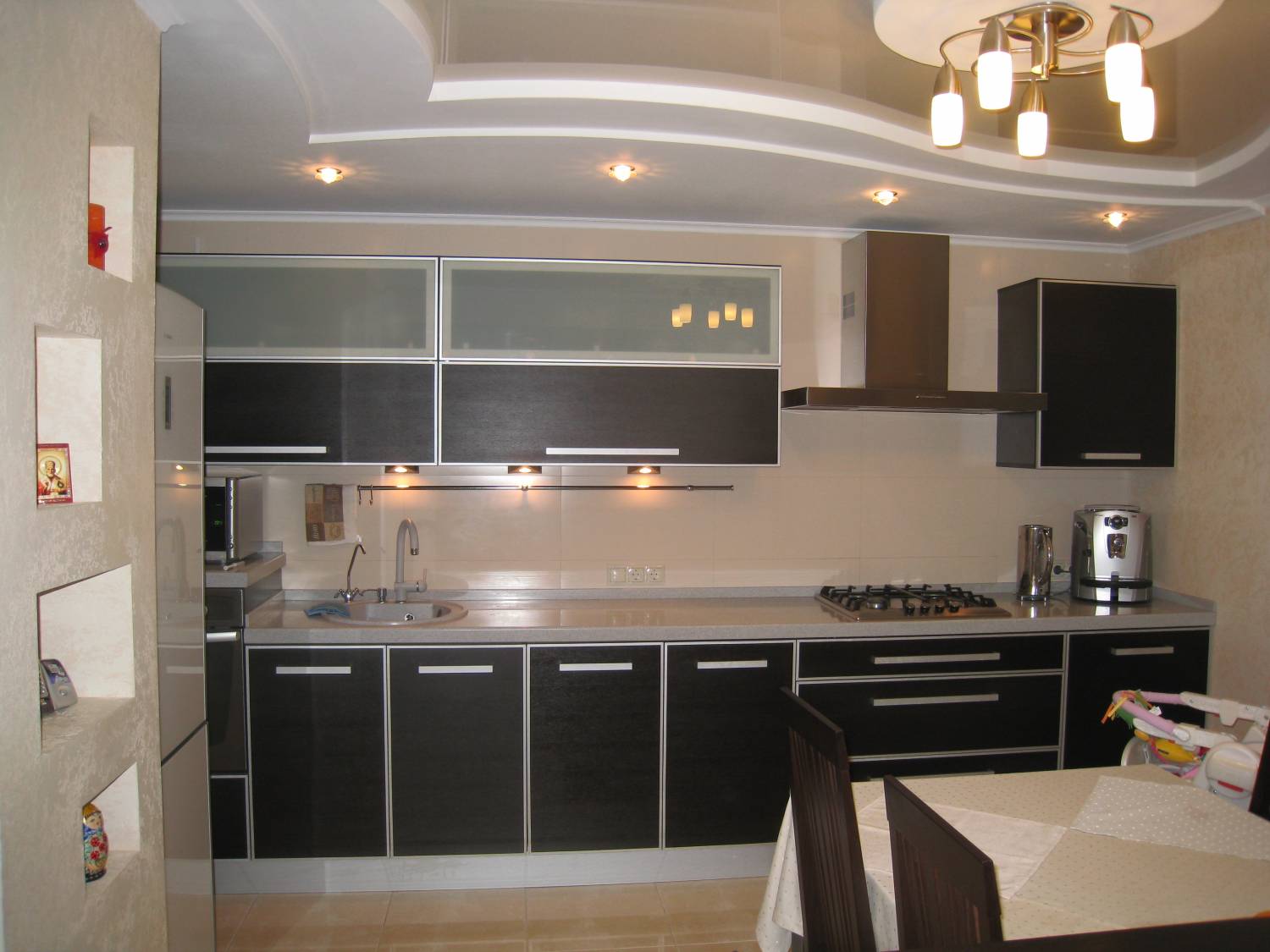- Подвесной потолок. Это лучшая система. Она позволит скрыть кухонные коммуникации. Подвесной потолок устанавливается достаточно легко. Установка может отнять всего один день, при условии работы профессионалов. Единственный минус данного решения – отнятие около десяти сантиметров от высоты комнаты.