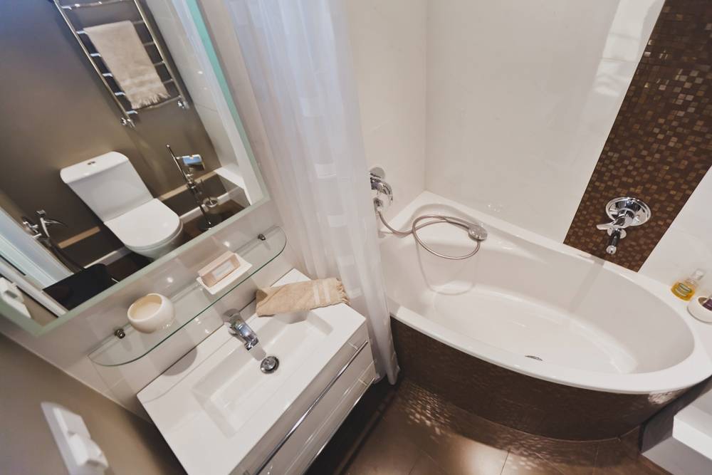 Здесь комната для купания не превышает 1,9 кв м, что позволяет разместить лишь душевую кабинку или ванную, умывальник нестандартного размера.